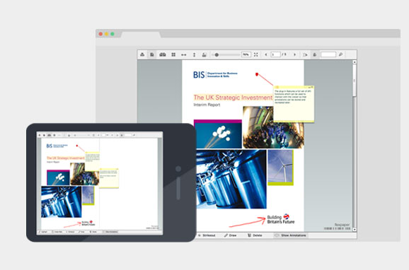 FlowPaper Classic Viewer with Annotations is an online PDF viewer specifically designed for online collaboration to mark, highlight or in other way annotate within your PDF documents. Reaches all major browsers, devices and operating systems including IE6 and IE7.